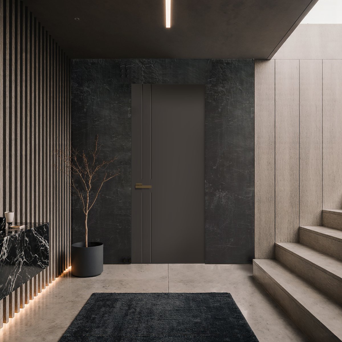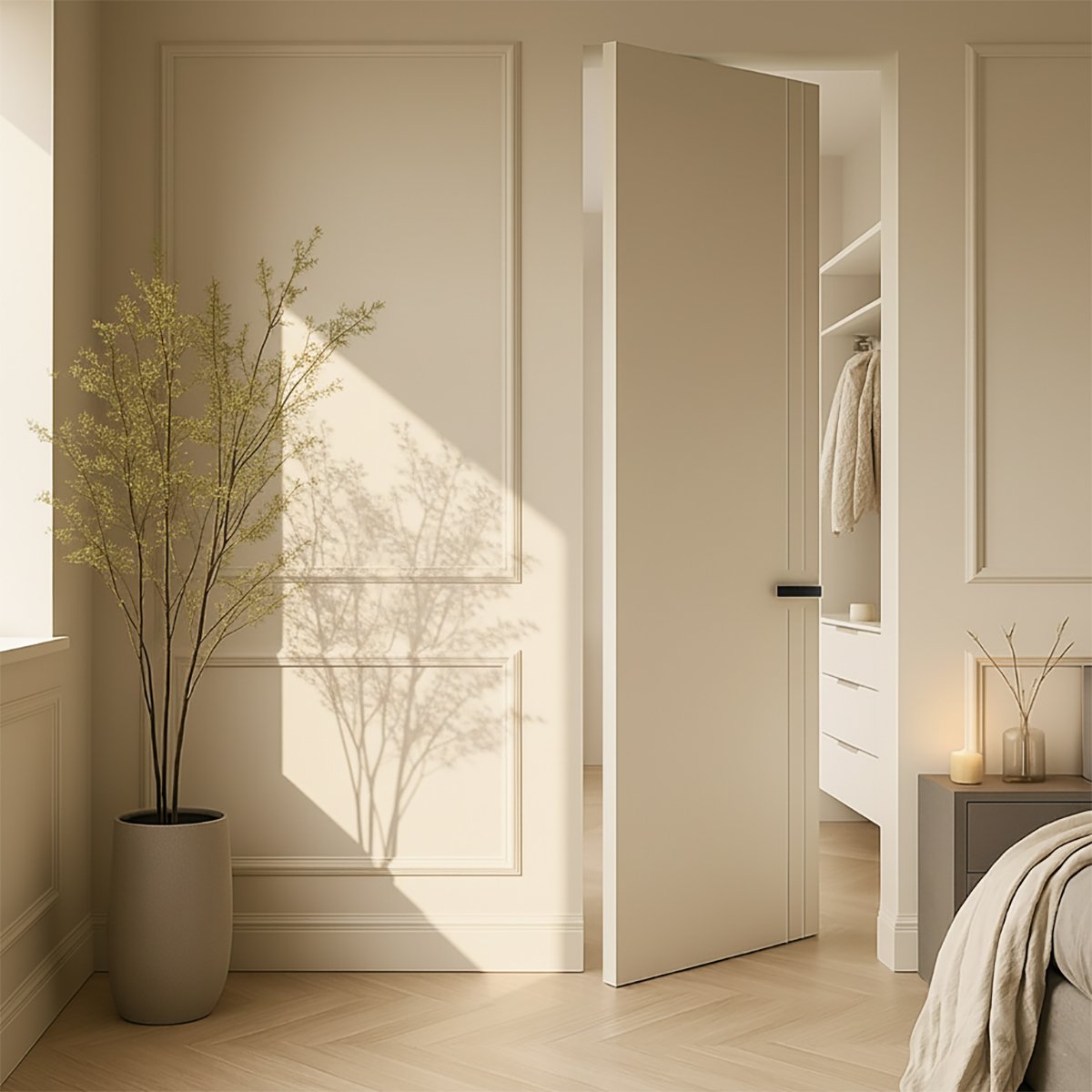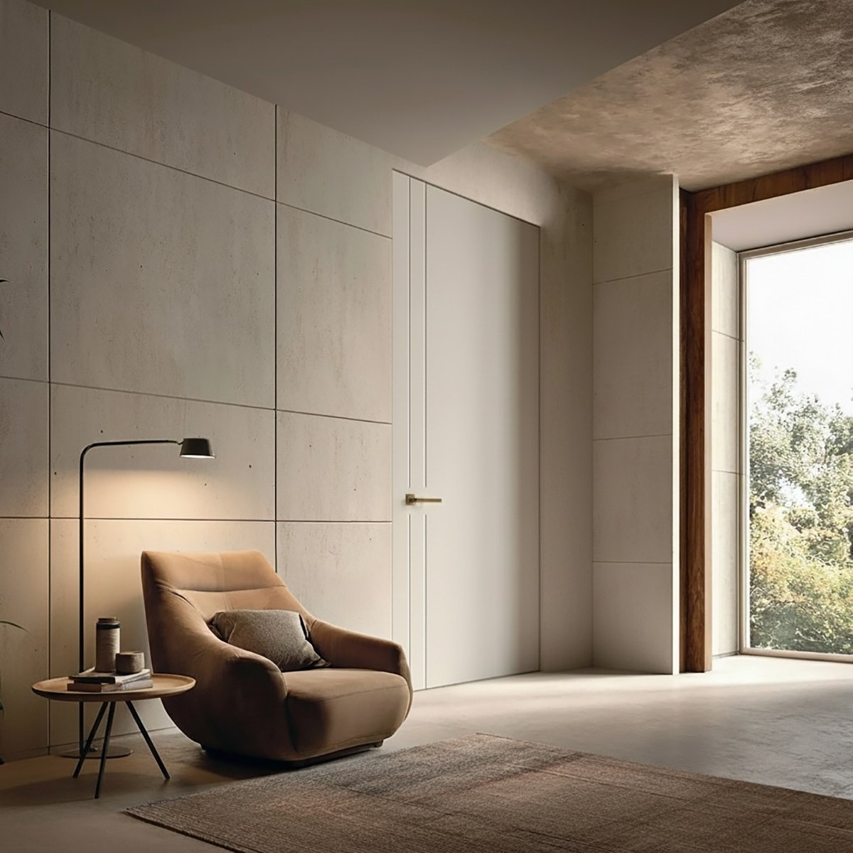 Enrasada a pared: sin tapetas, al ras del muro, lo que crea el efecto “puerta invisible” y una continuidad visual total en la pared.