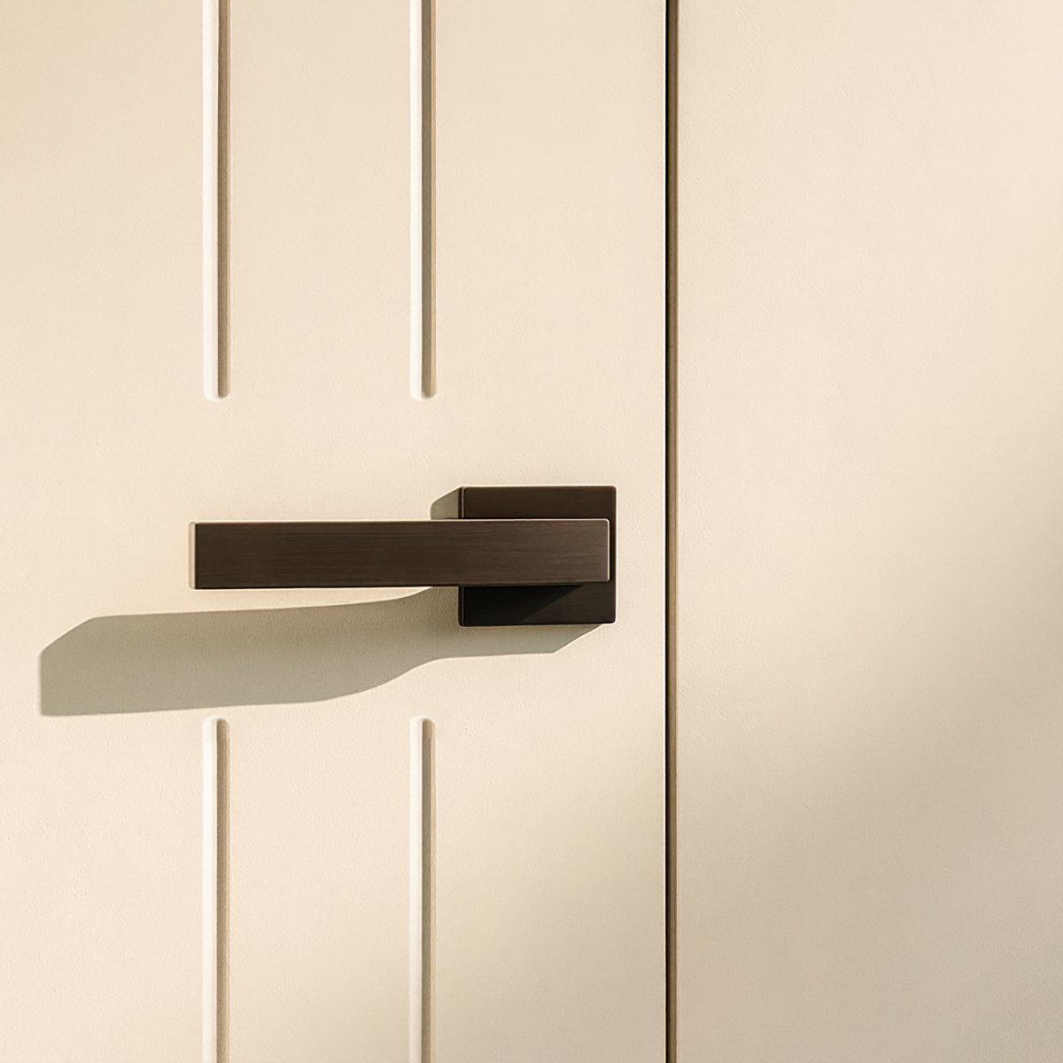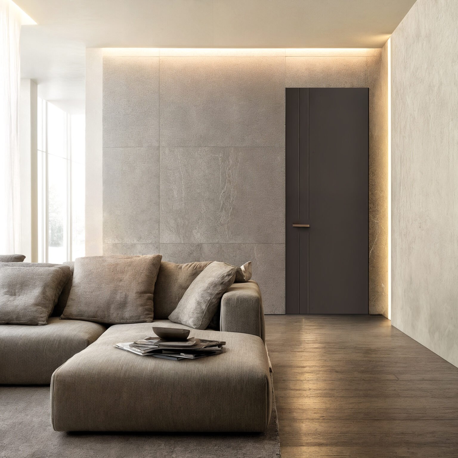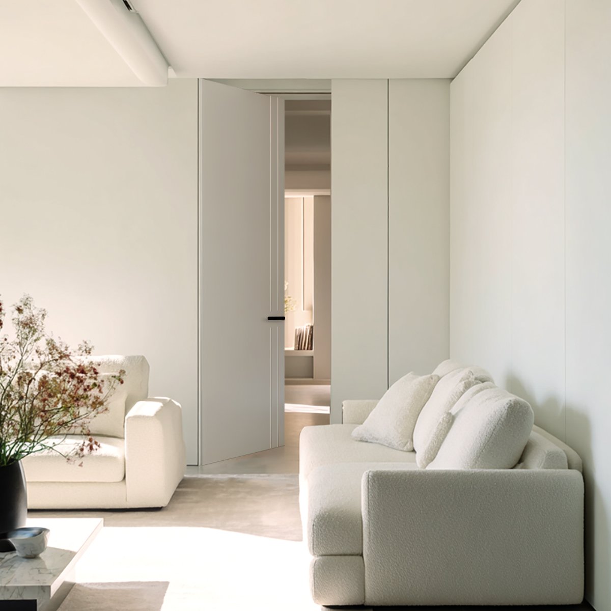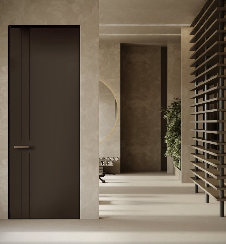 Puerta sin marco visible, SISTEMA INATEP, con hoja lisa y doble fresado vertical lateral que aporta un diseño minimalista y elegante. La hoja de la puerta queda totalmente a ras del tabique. La superficie continúa el plano de la pared para un acabado limpio y minimalista.