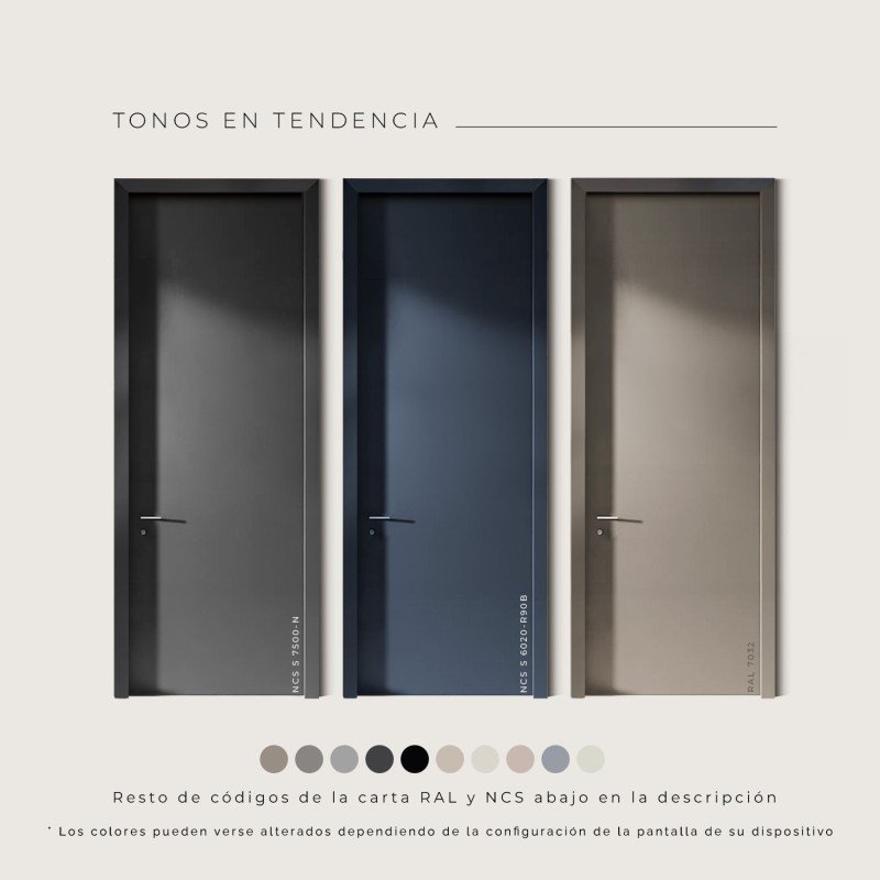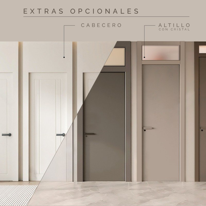 Puerta de paso en versión estándar servida en block, con cerco y tapetas lacadas a juego, lista para instalar sin clavos. Puedes configurarla hasta 211 cm de altura, y su estructura maciza en MDF se adapta al tipo de herraje: bisagra visible u oculta, además de opciones como puerta acústica o pivotante, entre otras configuraciones.