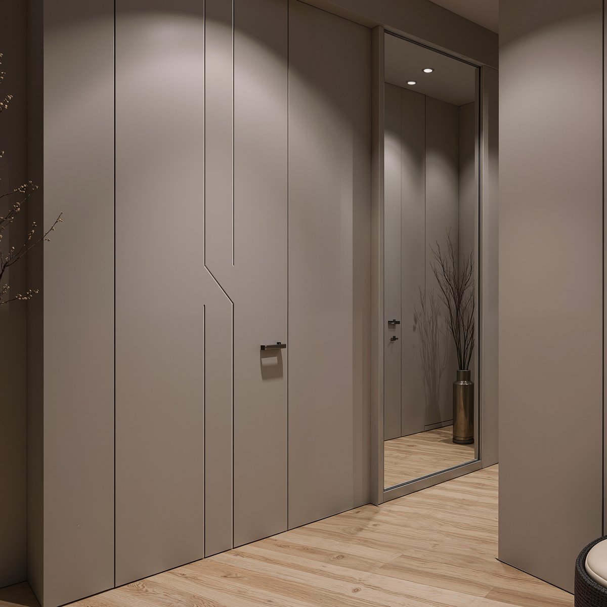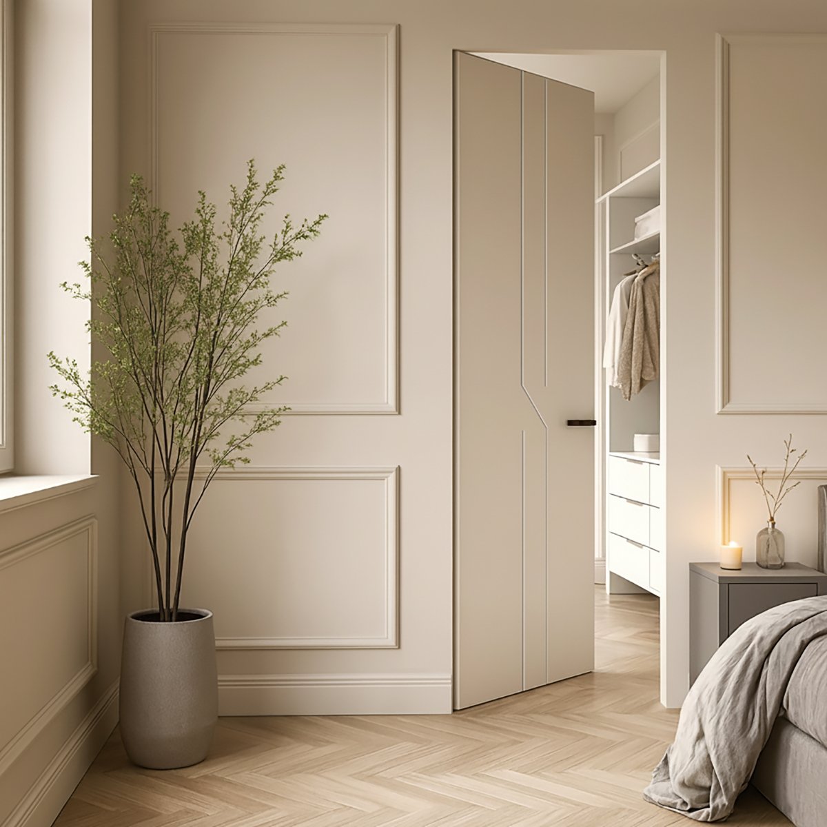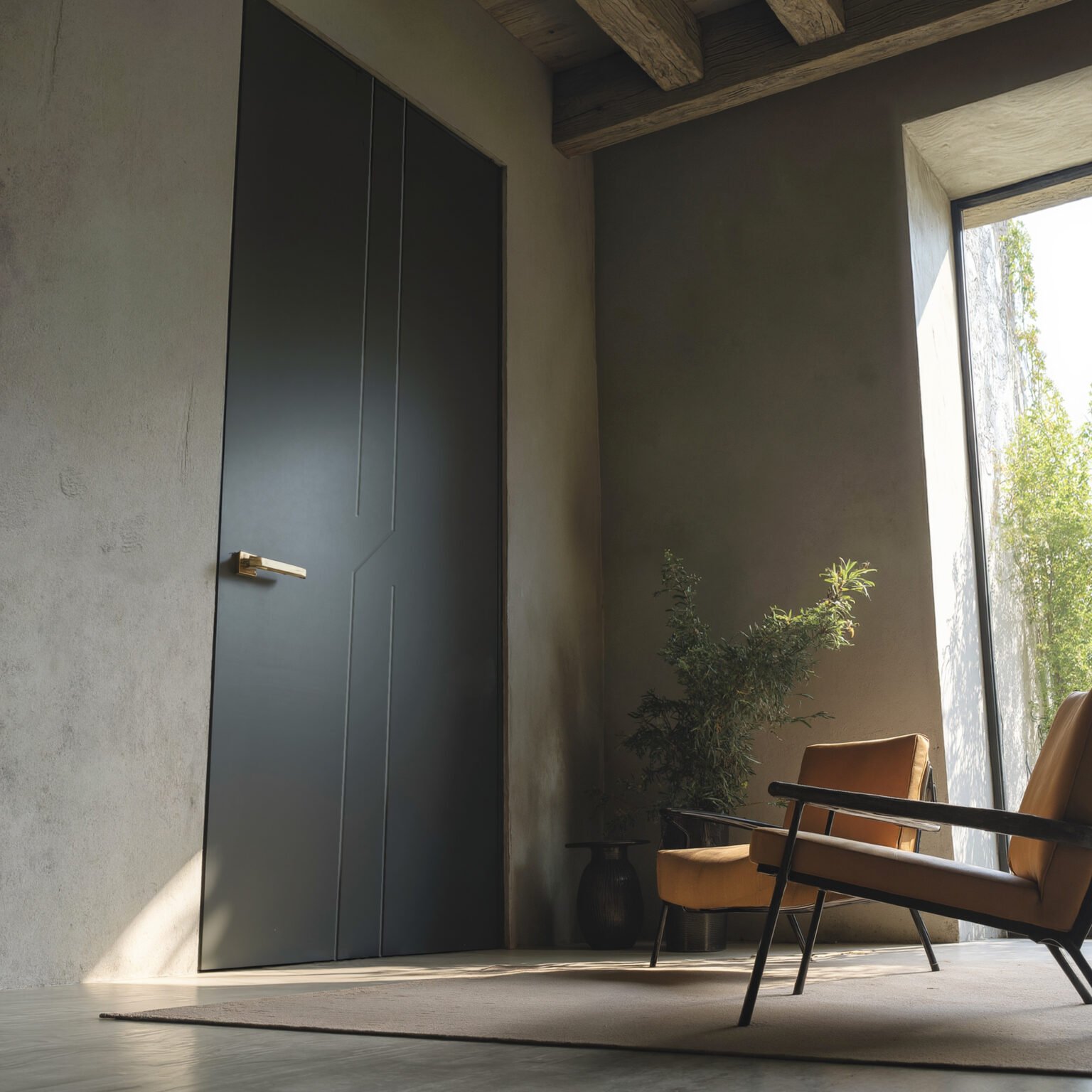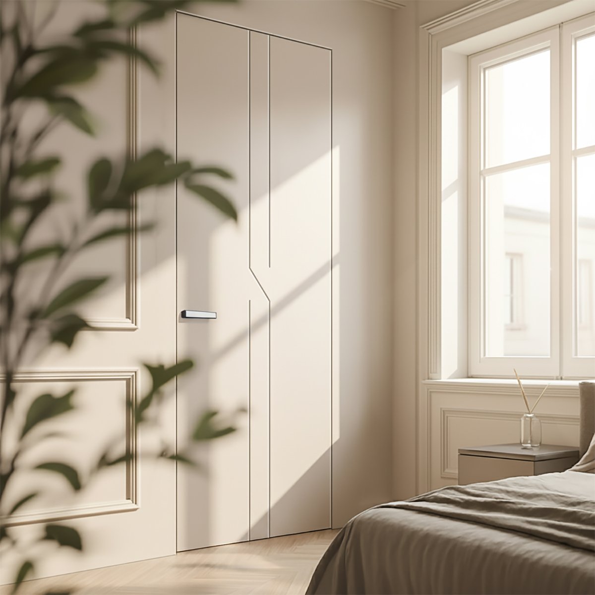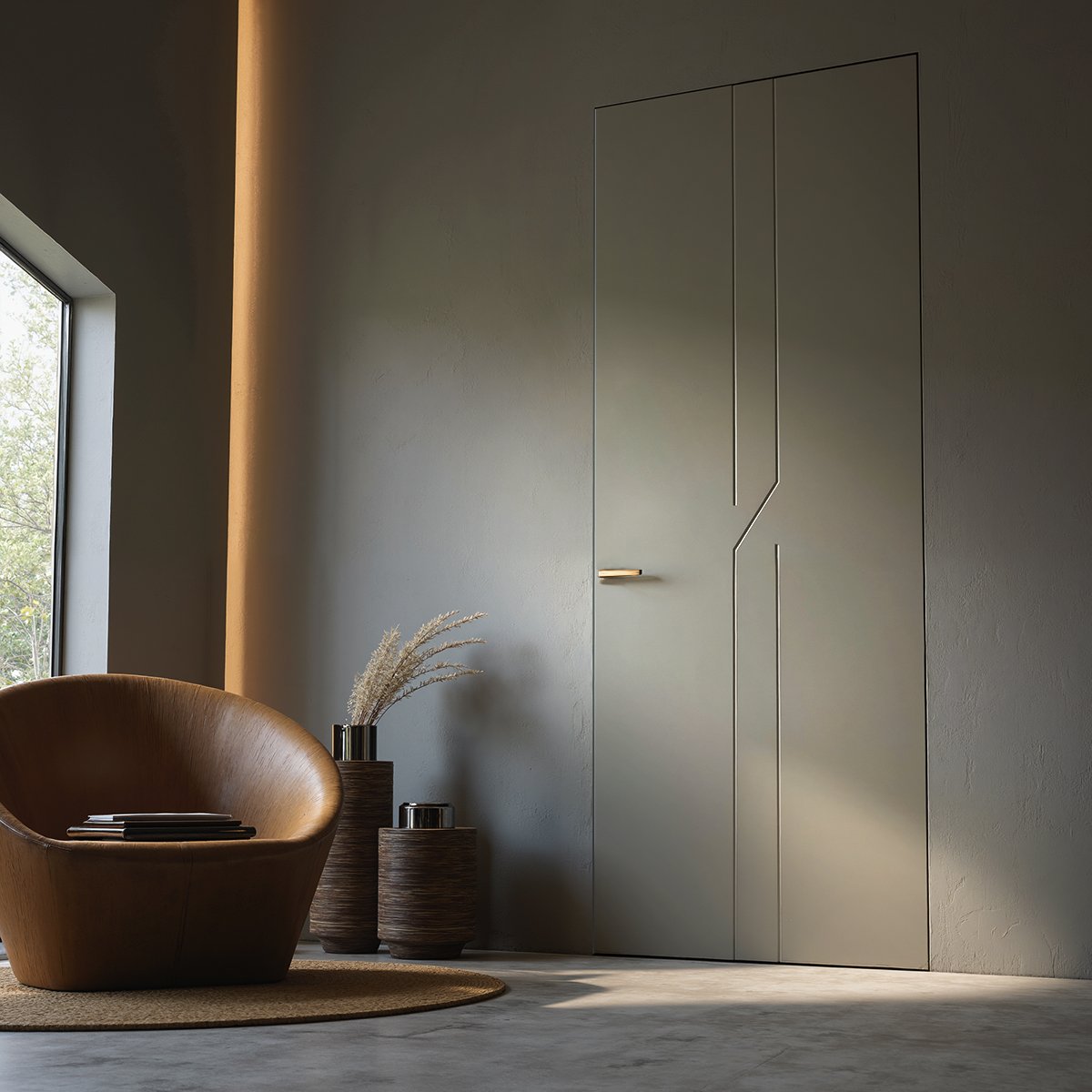 Enrasada a pared: sin tapetas, al ras del muro, lo que crea el efecto “puerta invisible” y una continuidad visual total en la pared.
