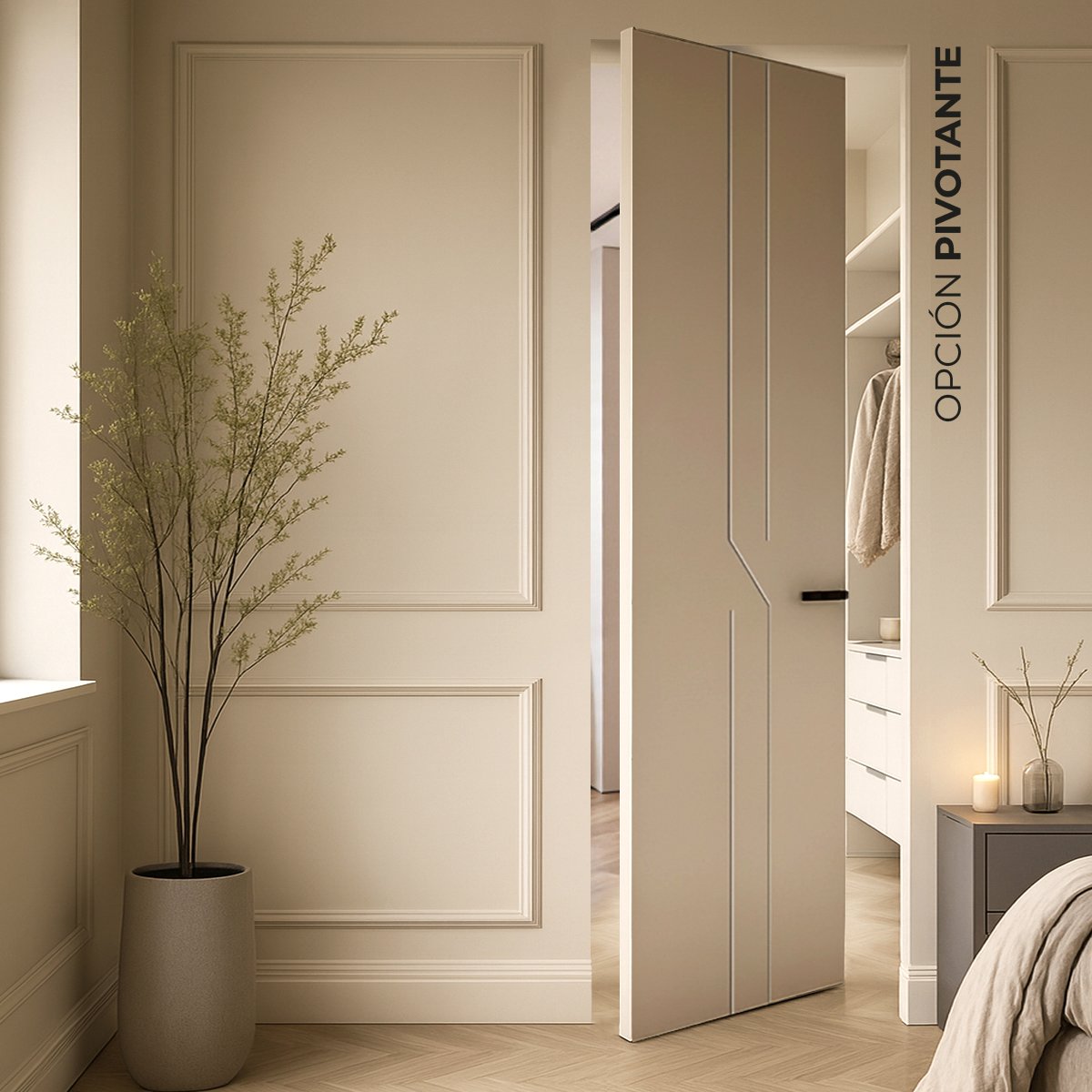 De serie, todas las puertas incluyen bisagras de pala y picaporte de gran calidad. También puedes elegir bisagras ocultas, totalmente invisibles y regulables, o el sistema PUSH magnético invisible para abrir y cerrar sin manilla. Estas opciones mejoran la estética y aportan un acabado más sofisticado y minimalista.