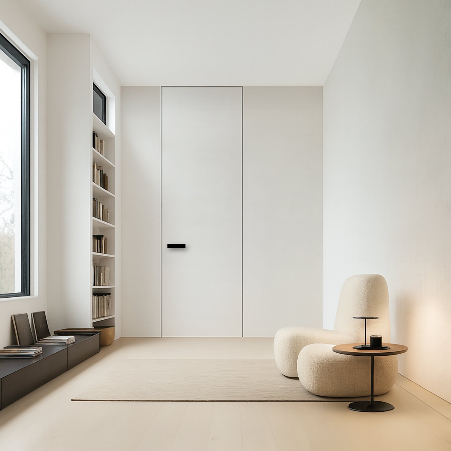 Puerta sin marco visible, SISTEMA INATEP, con hoja lisa que queda totalmente a ras del tabique. La superficie continúa el plano de la pared para un acabado limpio y minimalista.