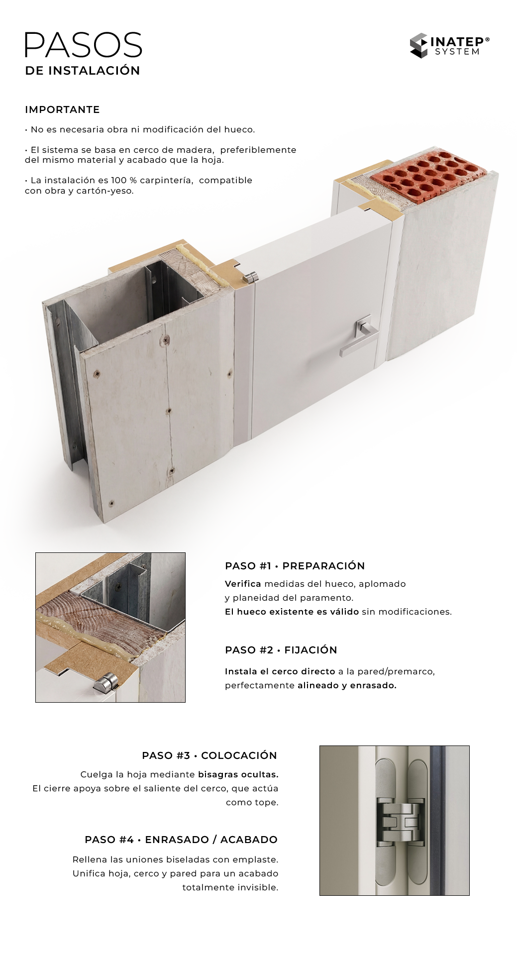 Más allá de su función estética, INATEP SYSTEM define una forma distinta de construir la puerta, ya que sustituye el marco convencional por una solución técnica pensada para proyectos contemporáneos, facilitando una integración precisa, controlada y sin necesidad de obra compleja.