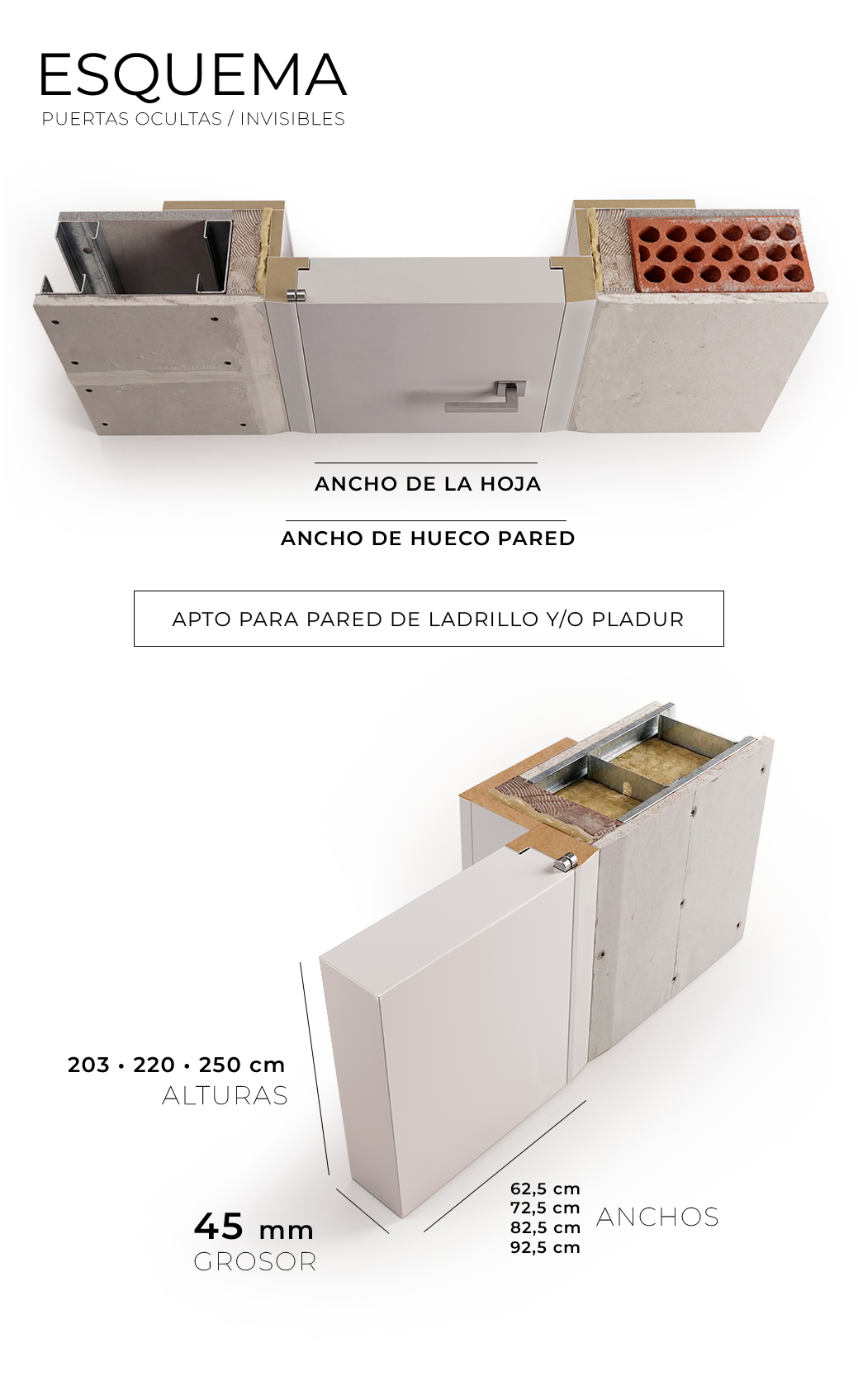 Cierre magnético silencioso y bisagras ocultas regulables. Apta para tabique de obra o pladur, enrase a 1 caras y posibilidad de altura estándar o hasta techo. Acabado lacado del color deseado.